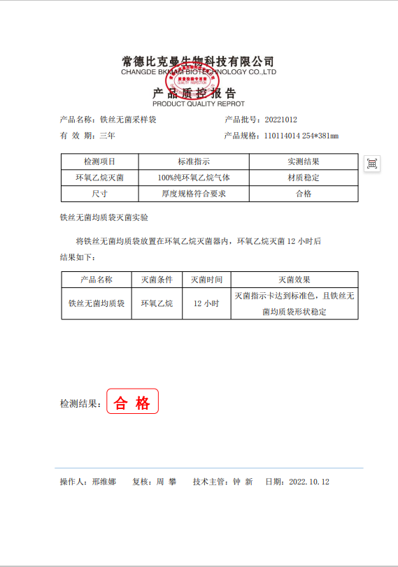 110114014 比克曼生物 鐵絲無菌采樣袋 254x381(帶書寫區(qū)域) 50個(gè)裝 20221012