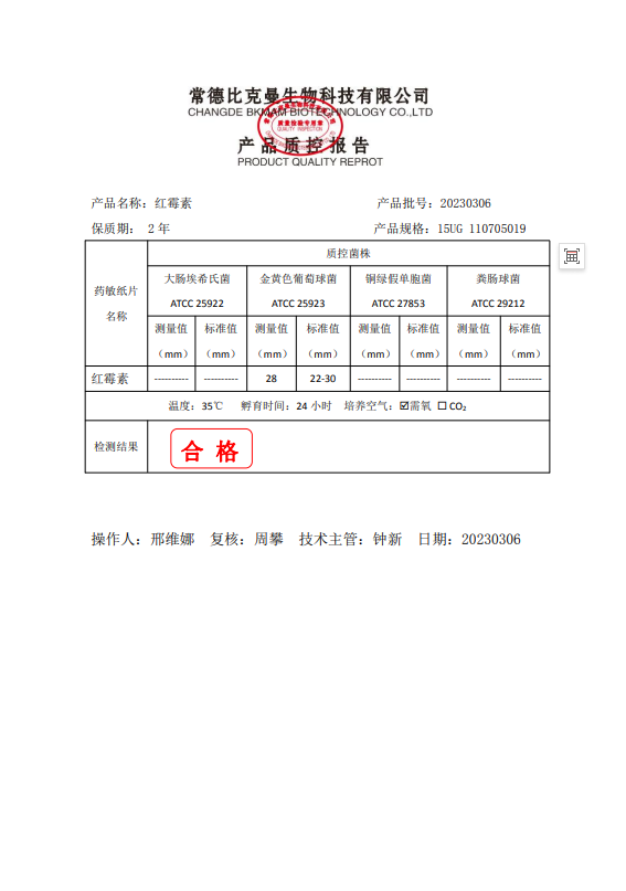 110705019 比克曼生物 紅霉素 15UG 20片瓶 20230306