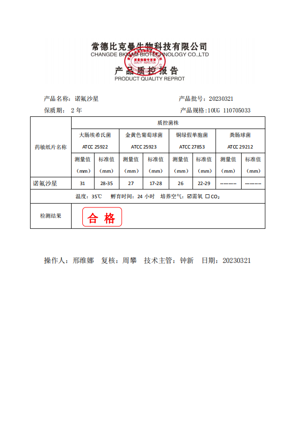 110705033 比克曼生物 諾氟沙星 10UG 20片瓶 20230321