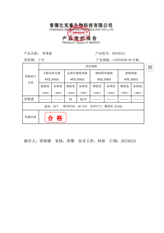 110705036 比克曼生物 青霉素 10UG 20片瓶 20230321