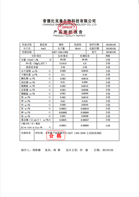 比克曼生物 氯化鈉 GR 優(yōu)級(jí)純 500g瓶 110702035 20230105