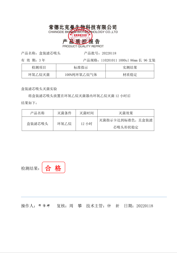 盒裝濾芯吸頭 1000ul 盒裝濾芯吸頭 86mm 96支裝 110201011 20220128 滅菌報(bào)告
